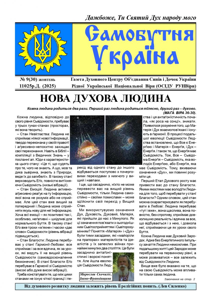 І слово "українець" у світі має малу вартість, бо українець нині не коваль своєї долі, українець не пан своєї життя і не володар своєї душі, ні, він живить свою душу чужими сумнівними правдами, чужими ритуалами та вірами – таке принижувальне життя породило в крові українця інстинкти меншвартості і обманливість. Українські провідні інтелігенти виховані Римом і Москвою, тримають (за чужими канонами) у духовій неволі і свій народ, потішаючи його чужими чудами греко-римо-юдейських преподобників і теоріями московських майстрів комунізму.